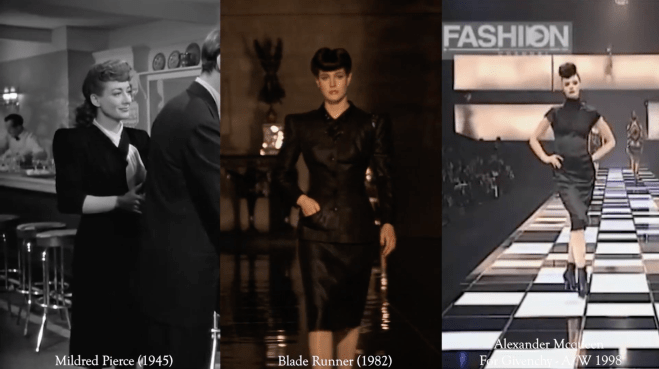 It is clear to see that Blade Runner has had an immense impact on the fashion industry beginning with its initial release in 1982 and expanding with each subsequent version/sequel. It is a concise representation of the past and future that (without the intertitle identifying the year) appears timeless in both its themes and aesthetics, as a result succinctly representing the present, resonating with people across all decades. “We have seen that Blade Runner exemplifies postmodern pastiche in its combination of sci-fi and film noir […] despite this combination of past and future, Blade Runner, is undoubtedly a film about the postmodern present.”4